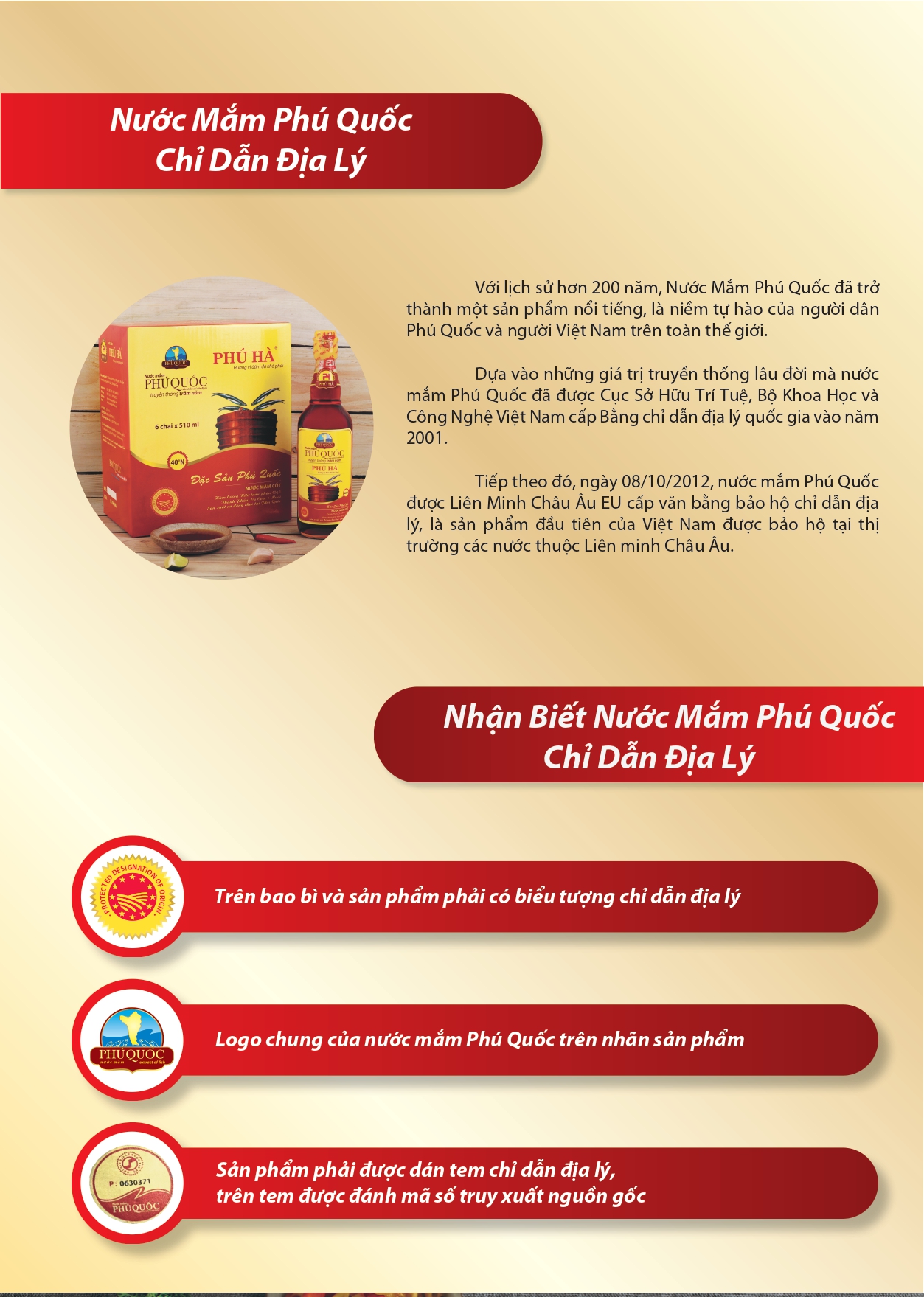 Bên cạnh đó, nước mắm của Phú Quốc vừa được liên minh Châu Âu bảo hộ là sản phẩm đạt chỉ dẫn địa lý, đây chính là thành quả cũng như sự xác nhận về chất lượng của nước mắm Phú Quốc đối với người tiêu dùng. Nước mắm Phú Hà tự hào là một trong những doanh nghiệp đầu tiên đáp ứng được những quy định, yêu cầu nghiêm ngặt để cung cấp đến cho người tiêu dùng trong và ngoài nước những sản phẩm nước mắm Phú Quốc mang chỉ dẫn địa lý.