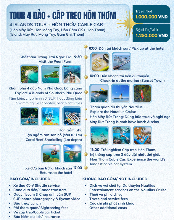 ✅ Lịch trình hấp dẫn: Hành trình được thiết kế lý tưởng, giúp bạn tận hưởng trọn vẹn vẻ đẹp Nam Phú Quốc.