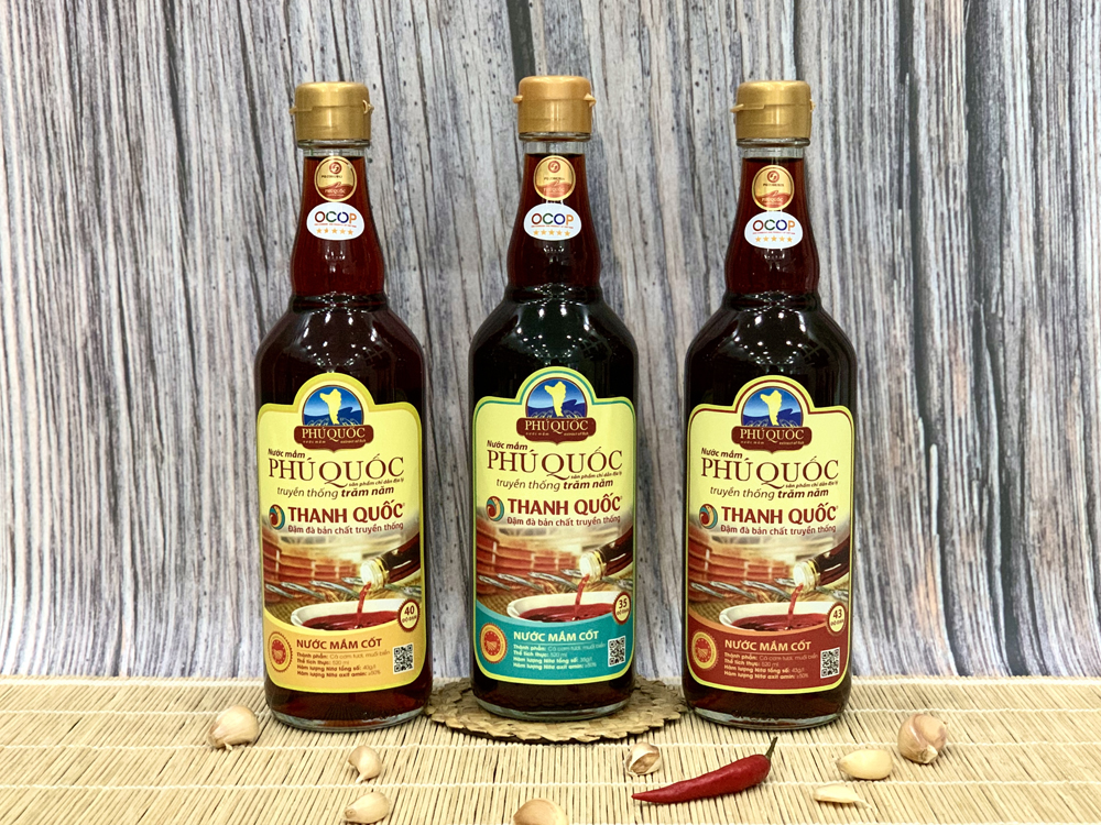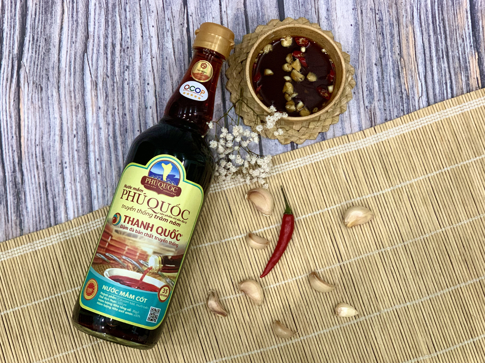 Nước Mắm Chỉ Dẫn Địa Lý Phú Quốc - Thanh Quốc 35 Độ Đạm – từ cá cơm tươi vùng biển Phú Quốc và muối Bà Rịa – Vũng Tàu, ủ chượp thùng gỗ 12–15 tháng theo quy trình truyền thống.