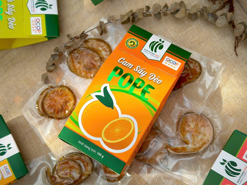Sản phẩm đã được chứng nhận OCOP 4 sao, khẳng định chất lượng và uy tín trên thị trường. Không chứa chất bảo quản, cam sấy dẻo POPE là sự lựa chọn an toàn tuyệt đối cho sức khỏe người tiêu dùng. Sản phẩm phù hợp với mọi lứa tuổi và dễ dàng mang theo khi đi làm, đi học, hay trong những chuyến du lịch, trở thành món ăn vặt lý tưởng cho những ai yêu thích sự tiện lợi mà vẫn đảm bảo hương vị thơm ngon và lành mạnh.