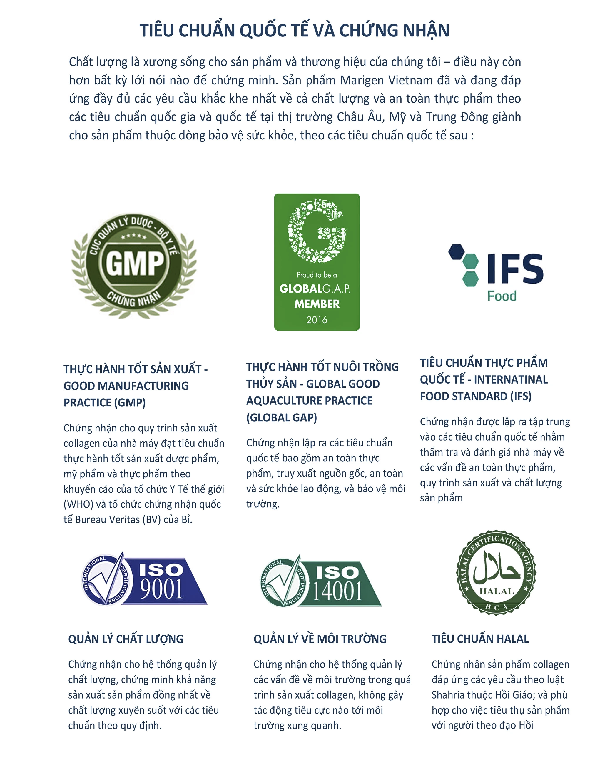 Da cá Basa nước ngọt tại đồng bằng sông Cửu Long là nguồn nguyên liệu chính dùng để sản xuất các sản phẩm của Marigen; tất cả sản phẩm này đều được kiểm soát chặt chẽ từ khâu nuôi và chế biến nguồn. da cá theo các tiêu chuẩn xuất khẩu nghiêm ngăt nhất như Global Gap, ISO 9001, ISO 14001, Halal và Good Manufacturer Practice (GMP), cùng với quy trình sản xuất collagen tự : động khép kín 100% theo công nghệ và thiết bị nhập khẩu từ Châu Âu.